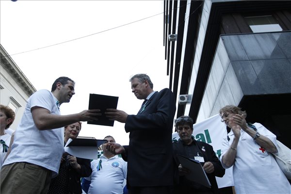 Időközben Zombor Gábor egészségügyi államtitkár is megérkezett a tüntetésre, ő is felment a színpadra. A tüntetők nem épp kedvesen fogadták: kifütyülték többször. Zombor ezért érthetően rövid beszédet mondott ezután: senkinek nem kell félnie, önöknek mindenben igazuk van. Az államtitkár ennek ellenére csak annyit tudott ígérni, hogy ami a hatásköre, abban igyekszik előrelépést elérni. Beszéde után Kiss László, a Független Egészségügyi Szakszervezet elnöke és Balogh Zoltán MESZK-elnök is petíciót adott át.