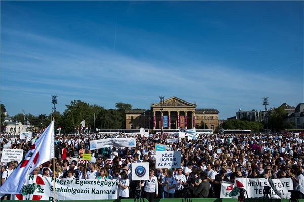 Béremelést, megbecsülést, a munkakörülményeik javítását követelte több ezer, feketébe és fehérbe öltözött egészségügyi dolgozó. Két helyszínen demonstráltak: a Magyar Egészségügyi Szakdolgozói Kamara (MESZK) szervezésében a Hősök terén, az Őszintén az Egészségügyről Akciószervezet szervezésében a Clark Ádám téren és a Kossuth téren tüntettek.