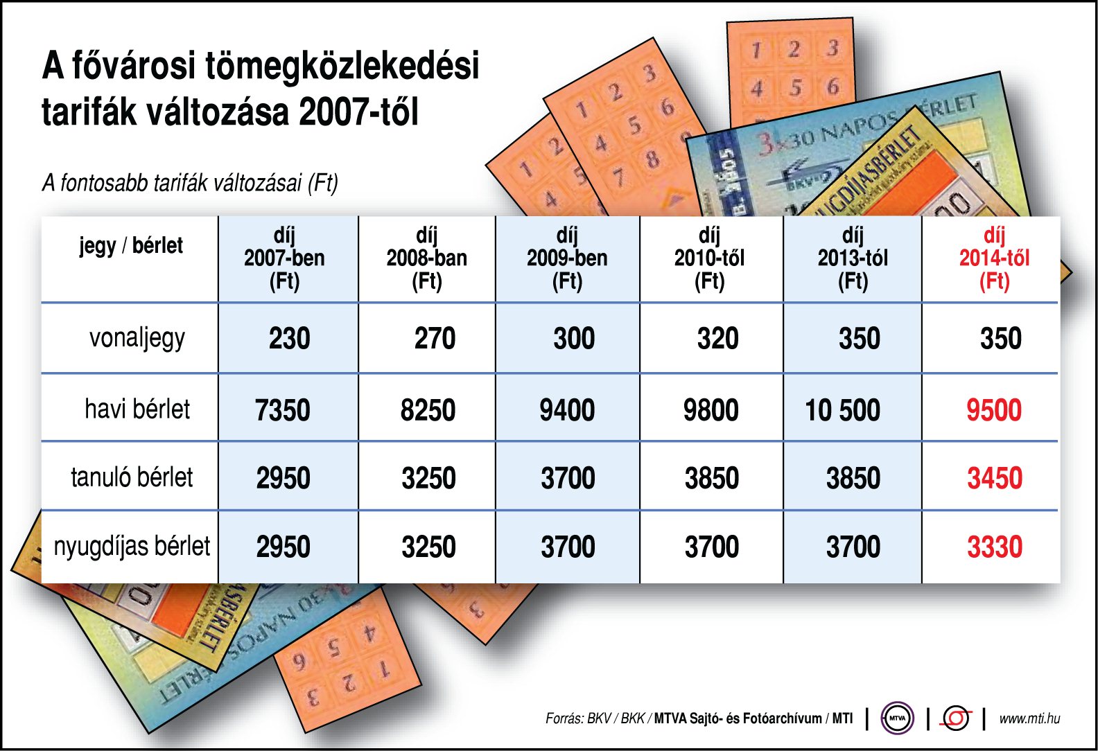 Januártól a teljes árú havi bérlet 10 500 forint helyett 9500 forintba, a dolgozók kedvezményes éves bérlete 114 600 forint helyett 103 ezer forintba, a tanulók havi bérlete 3850 forint helyett 3450 forintba, a nyugdíjasoké pedig 3700 forint helyett 3330 forintba kerül jövő évtől.