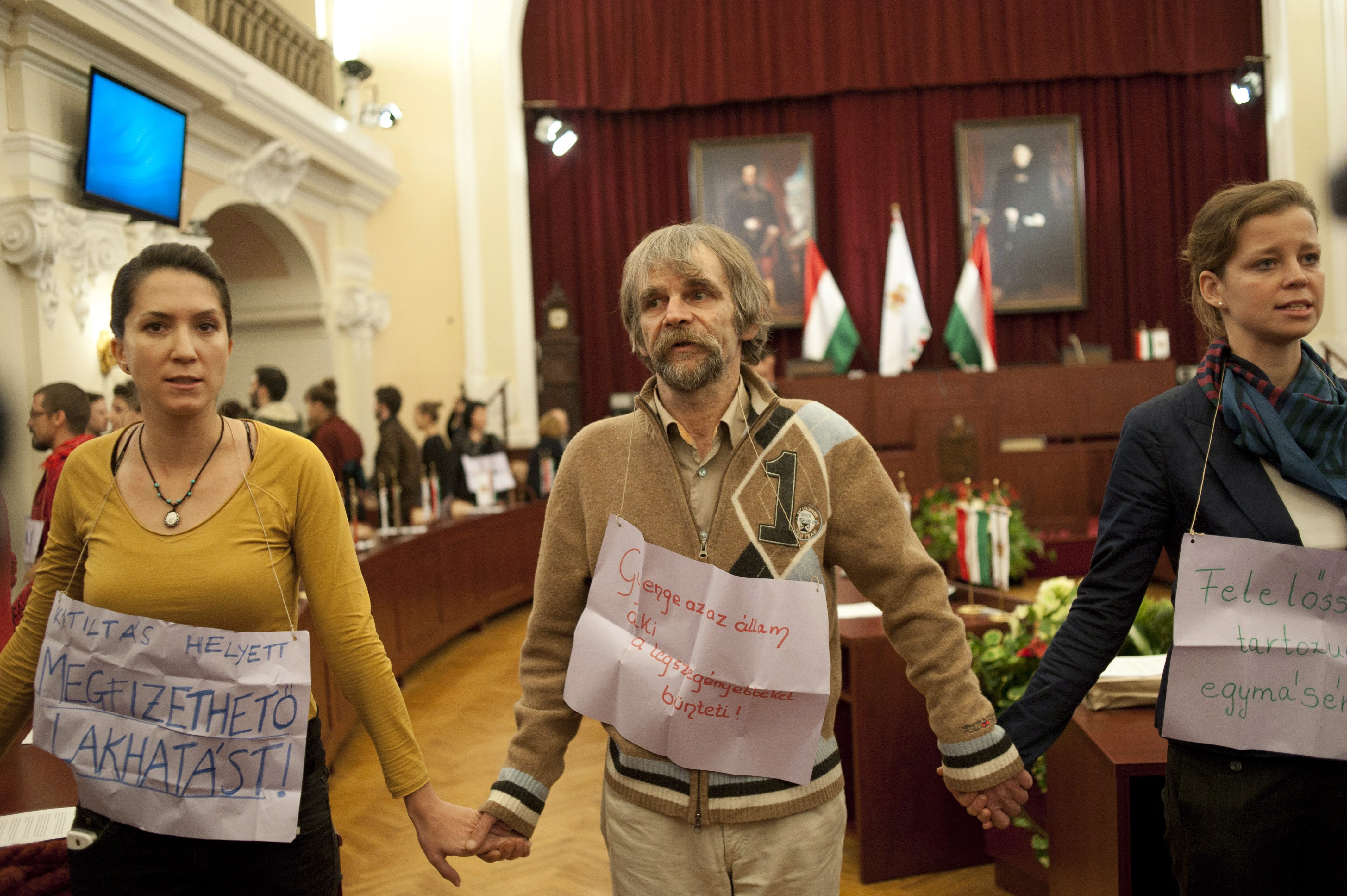 Élőlánccal tiltakoztak a Fővárosi Közgyűlés termében a Város Mindenkié csoport tagjai a hajléktalanok kiszorítása ügyében hozott rendelet ellen. Az előterjesztést végül megszavazták a városatyák.